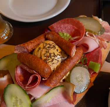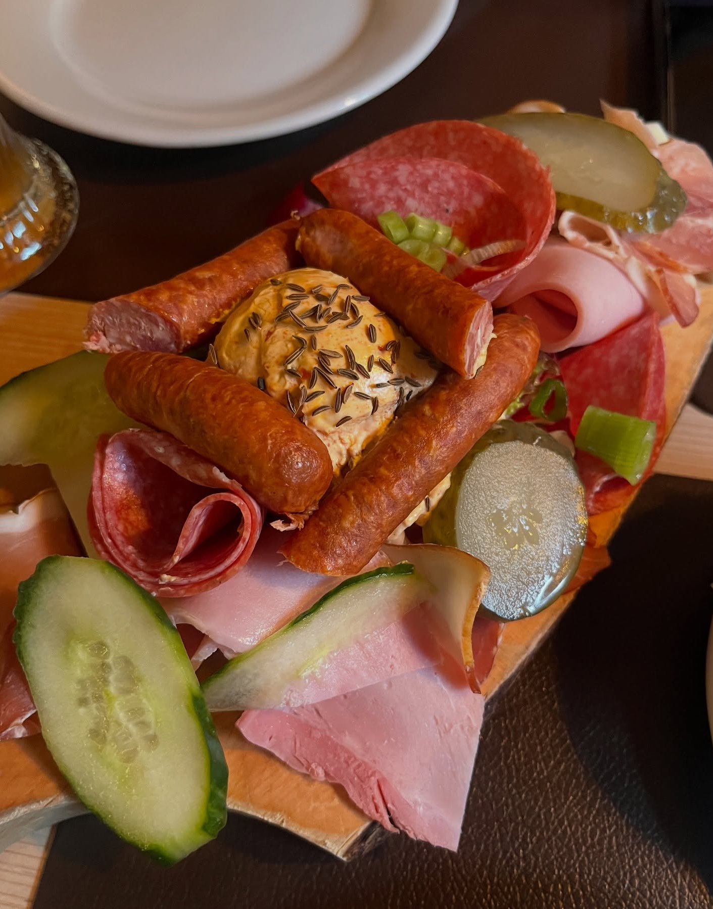 Bayerische Kalte Platte (£19.50)—Cooked ham, black forest ham, German pepper salami, Alpine cheese, Obatzda and cherry tomatoes served with a freshly baked pretzel and sliced rye bread